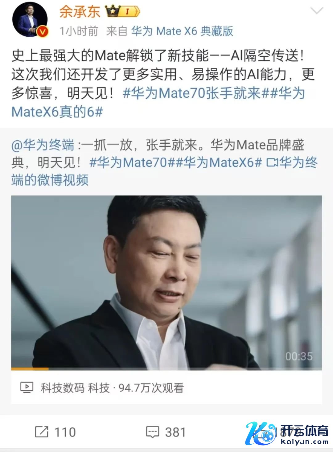 随后余承东转发这条微博,并示意“史上最弘大的Mate解锁了新时候-AI隔空传送,此次咱们还开采了更多实用、易操作的AI智商,更多惊喜,未来见!”