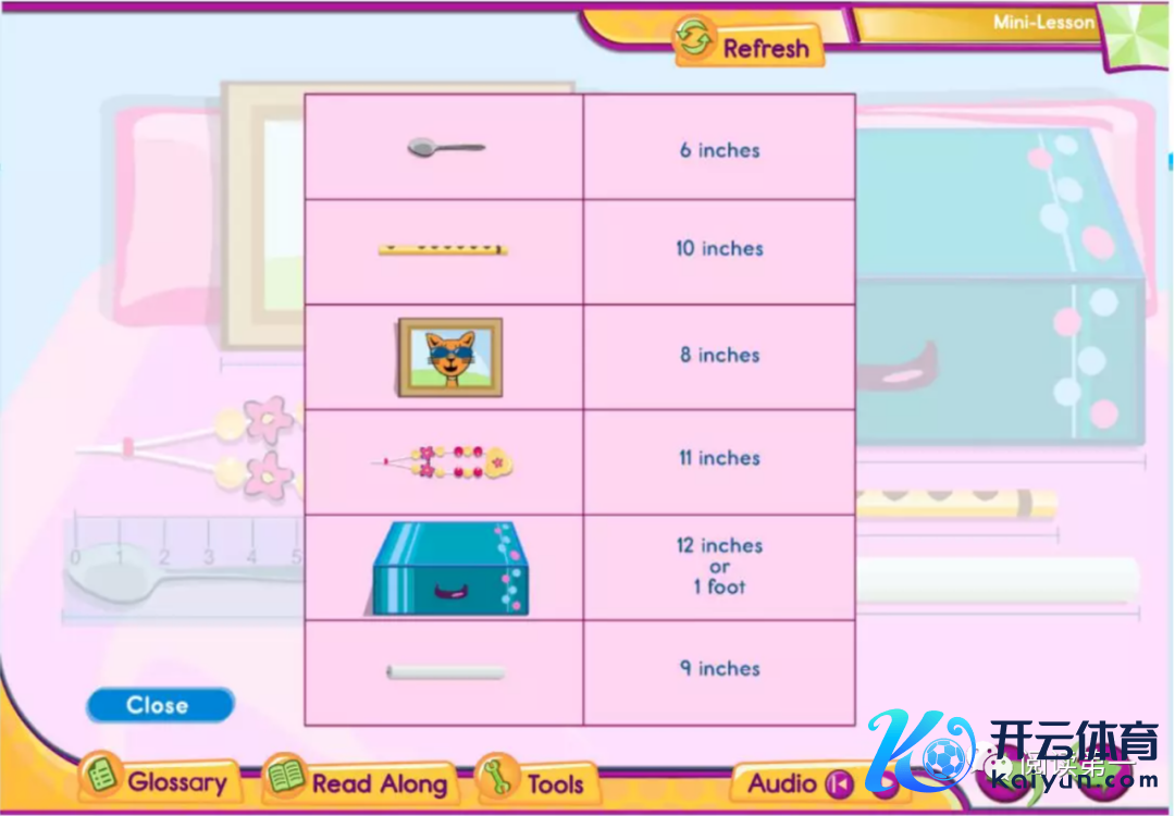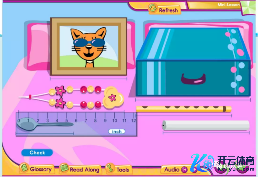 有些Lesson里就自带了互动要道,比方学测量的这节数学课上,孩子们就可以解放拖动尺来测量图中各个物品的尺寸。