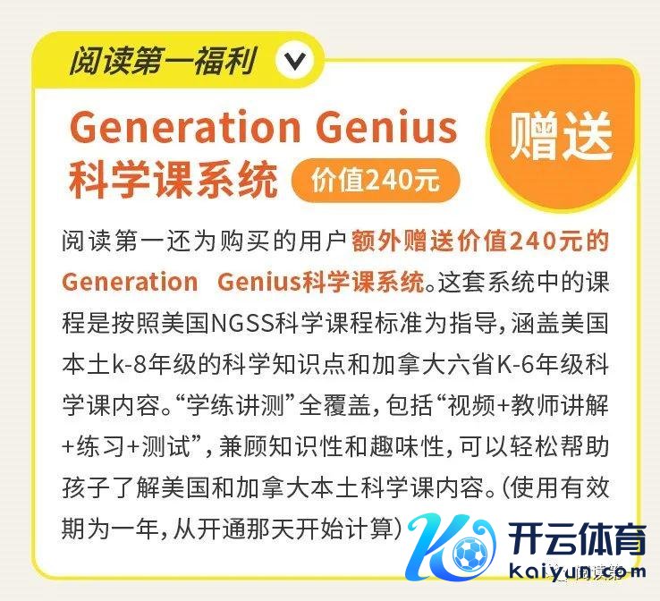 另外,当作福利,阅读第一还为购买的用户很是施济价值240元的Generation Genius科学课系统。这套系统中的课程是按照好意思国NGSS科学课程尺度为素质,涵盖好意思邦原土k-8年级的科学学问点和加拿大六省K-6年级科学课本色。“学练讲测”全秘籍,包括“视频+西宾教养+进修+测试”,兼顾学问性和酷爱酷爱性,可以节略匡助孩子了解好意思国和加拿大原土科学课本色。(使用灵验期为一年,从开通那天脱手蓄意)