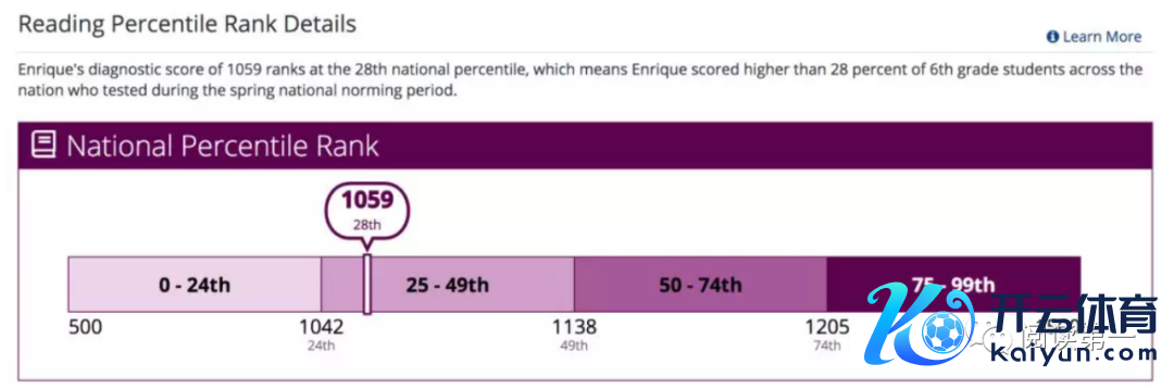 该学生在Languageand Vocabulary测试的15个侦查点里作念对了8题,Reading Literature阅读手段测试的15个侦查点里作念对了8题,Reading Informational Text阅读信息性文本测试的15个侦查点里作念对了9题。初测戒指,学生的分数是1059,全好意思Percentile28%。