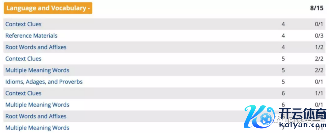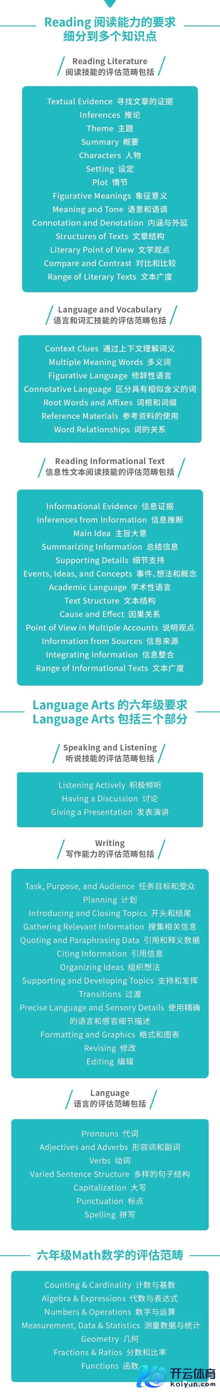 以六年级为例,可通过滑动下图具体了解Reading、Language Arts和数学三方面每个学问点的条款。