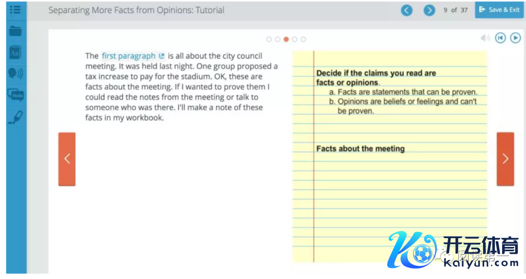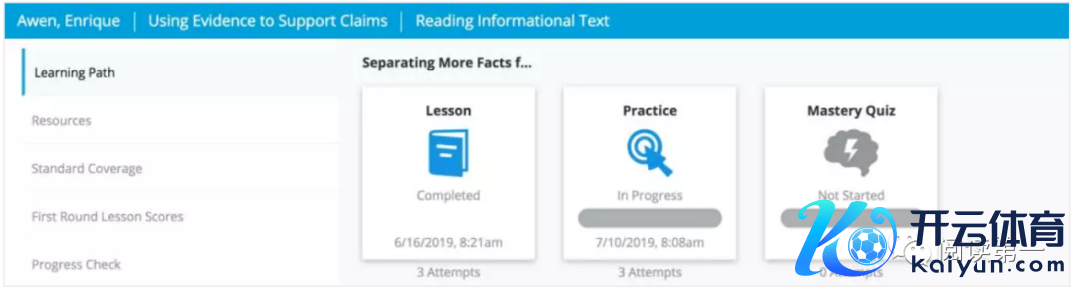 以高年级阅读课中的Using Evidence to Support Claims-寻找接济论点的论据,这个手段学习为例,学生会进行课程的学习+进修+测试。