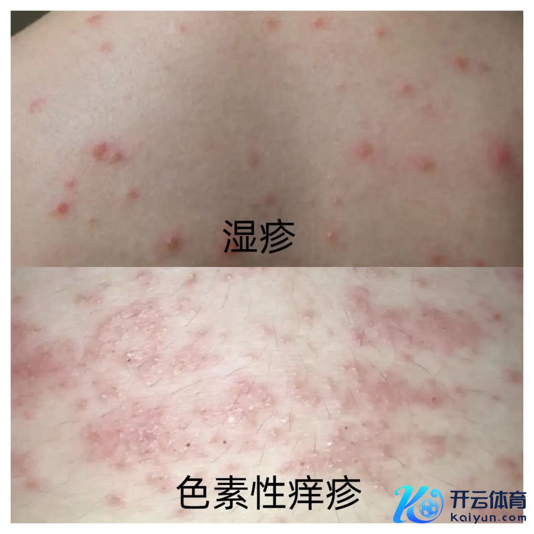 色生性痒疹 好发于颈、背、肩胛、前胸等部位, 自发剧烈瘙痒,早期以红斑、丘疹、斑块为主,证实期可在原皮疹的基础上出现多发性小水泡,消退期水疱干涸痂皮,酿成暗红色斑疹、斑丘疹。晚期皮疹消退后出现和会成片的棕褐色色素千里着斑。