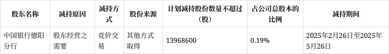 按照最新收盘价2.99元测算,套现款额约合4176.61万元。减捏原因为激动接头之需要,股份起首为其他容貌获取。截止当今,中国银行德阳分行捏股数目3.46亿股,占总股本比例为4.79%。